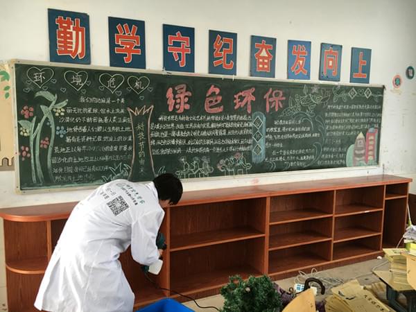 我們發(fā)現教室的黑板報上學生寫的都是對綠色環(huán)保環(huán)境的強烈愿望!